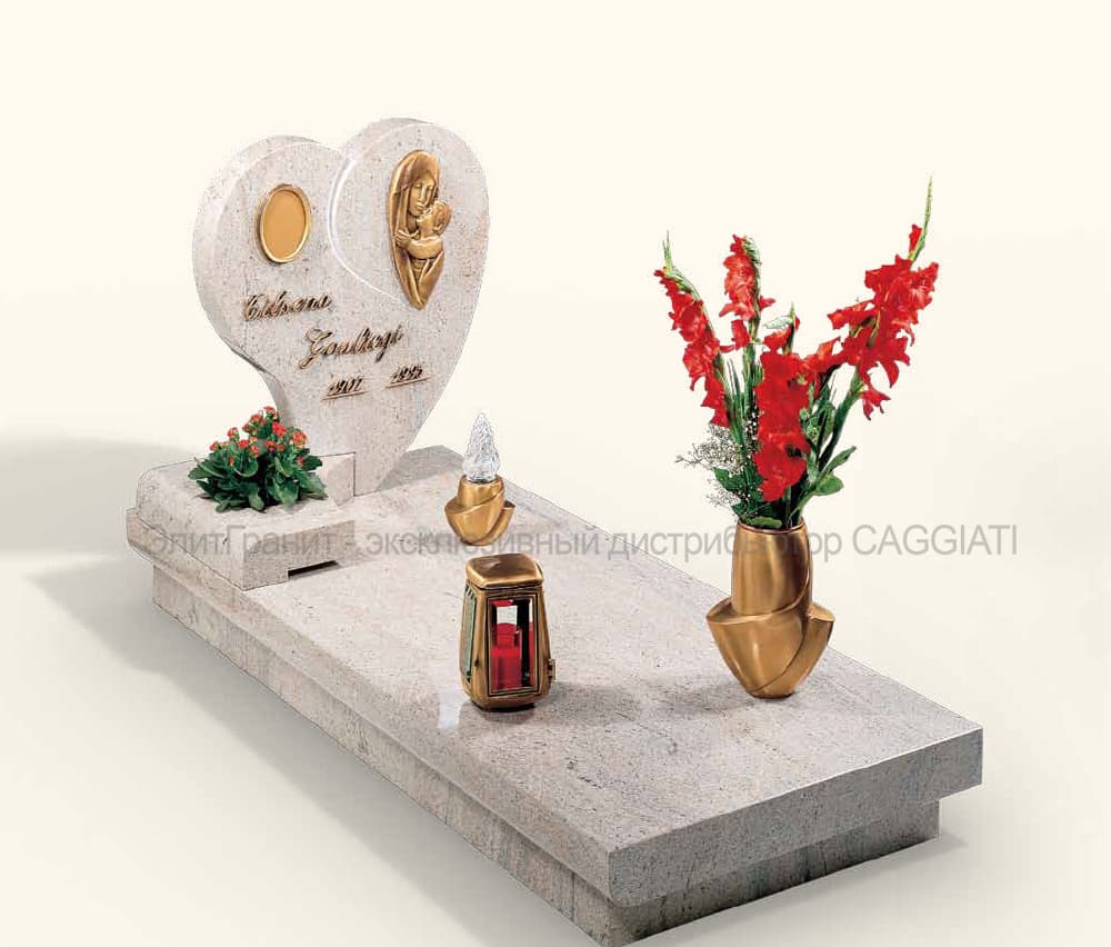 Особенно выгодно памятник в фоме сердца будет выглядеть из красного гранита. Художественное оформление памятника из красного гранита часто под собой подразумевает необходимость использовать накладные элементы Caggiati. Так как гравировка на цветной текстуре будет теряться и не иметь должного контраста, именно бронзовые накладные элементы будут выделяться и подчеркивать текстуру. В ином случае мы рекомендуем покрытие сусальным золотом самой гравировки.